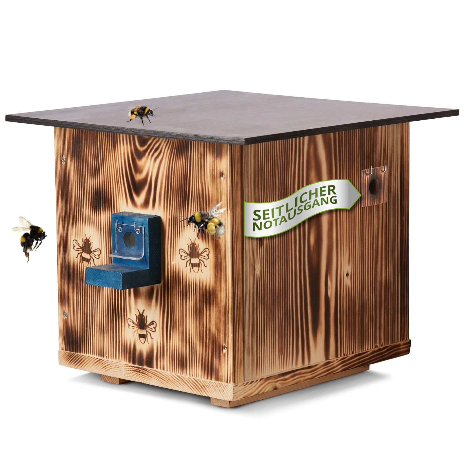 Das Hummelhaus – ist aus 20mm starken Vollholz. Das Dach ist Witterungsbeständig. Der Hummelkasten ist mit einer Hummelklappe ausgestattet, die ein wirksamer Schutz der Hummelkolonie vor fliegenden Insektenschädlingen wie Schwebfliegen, Wespen und Wachsmotten – den Hauptschädlingen anbietet.