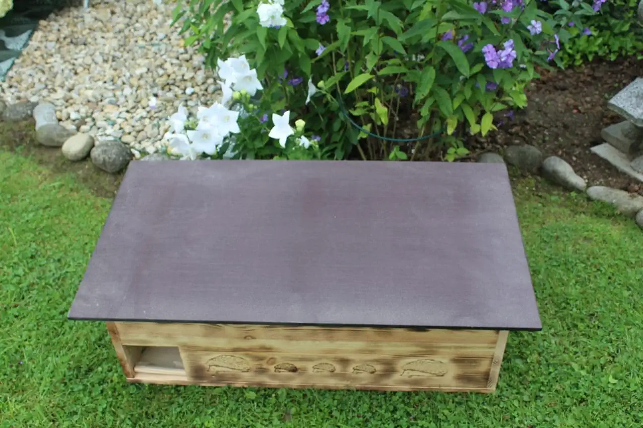 Das Igelhaus verfügt über ein abnehmbares Dach, das eine einfache Reinigung und Beobachtung ermöglicht. Dank unserer innovativen Befestigungsmethode ist die Sicherheit des Igels und Ihrer Familie gewährleistet. Wir haben bewusst auf Scharniere verzichtet, da diese mit der Zeit fest werden könnten und potenzielle Verletzungen verursachen könnten.